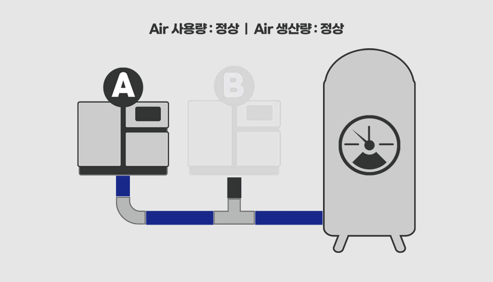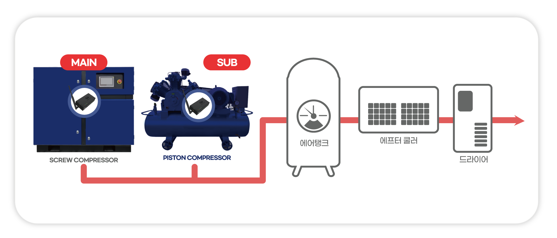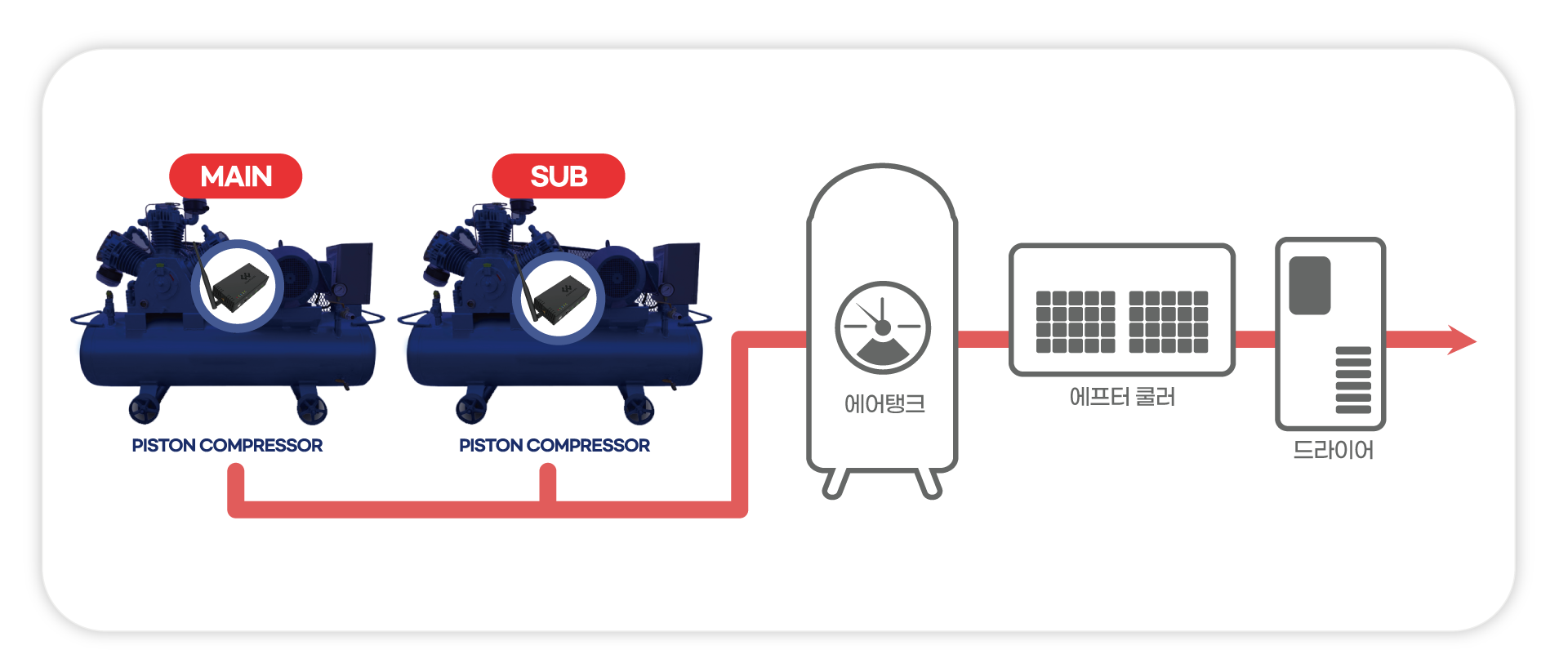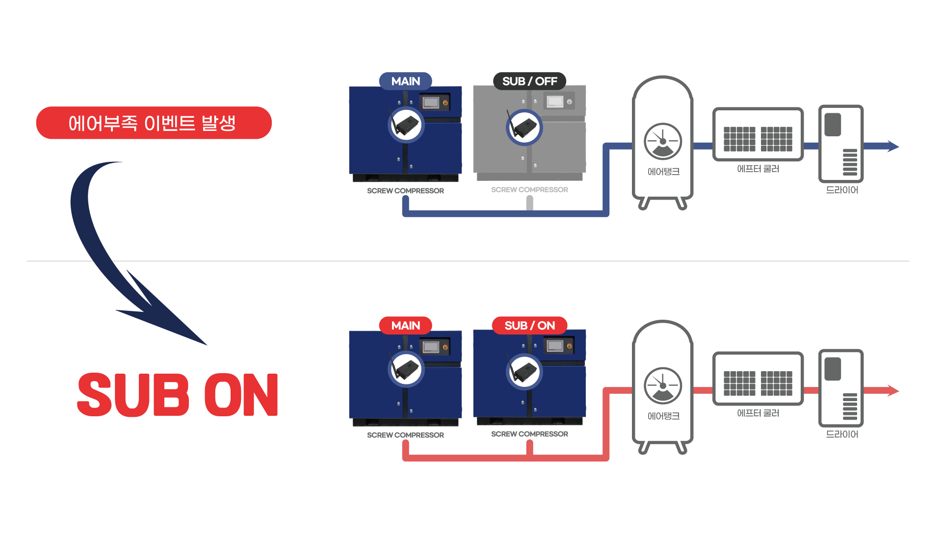 급작스러운 에어 사용량 증가 및 컴프레서 불량 등의 사유로 압력이 떨어질 경우 자동으로 서브 컴프레서를 추가 기동하여 에어 생산을 보충, 적정 압력에 도달될 시 기동 중지 기능
